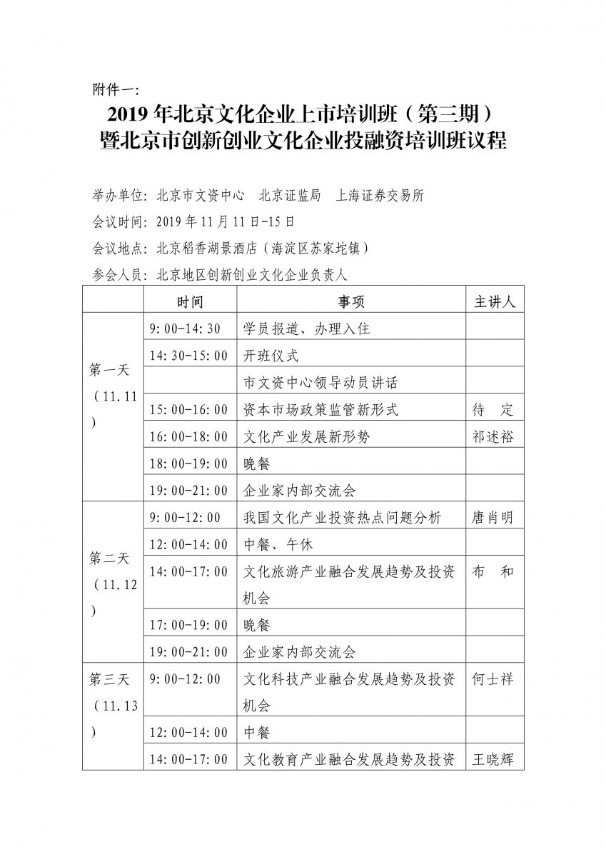 1. 北京文化企业上市培训班(第三期)暨北京市创新创业文化企业投融资培训班议程