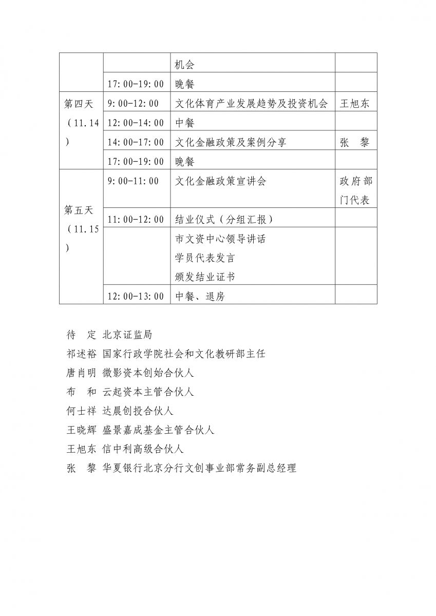 (四)课程安排:本次培训安排知名投资机构代表为主要主讲老师,侧重从投资的角度关注文化产业发展过程中的重点、热点、趋势问题,同时涵盖文化金融政策、资本市场新形势等问题,并设计政企交流会、与知名投资机构交流互动环节(培训议程见附件1)。