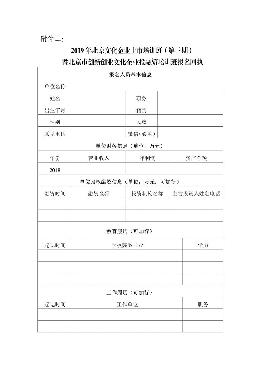 2. 北京文化企业上市培训班(第三期)暨北京市创新创业文化企业投融资培训班报名回执